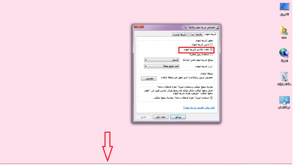 اخفاء شريط المهام يختفي شريط المهام الا اذا وضعتي الماوس على مكانة يظهر انظري الى مكان الماوس لاحظي اختفاء الشريط