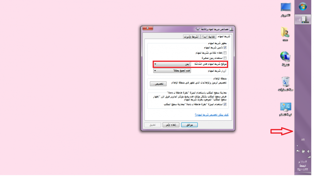 لو اخترنا ايمن ينتقل شريط المهام الى الجهه اليمنى
