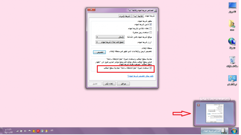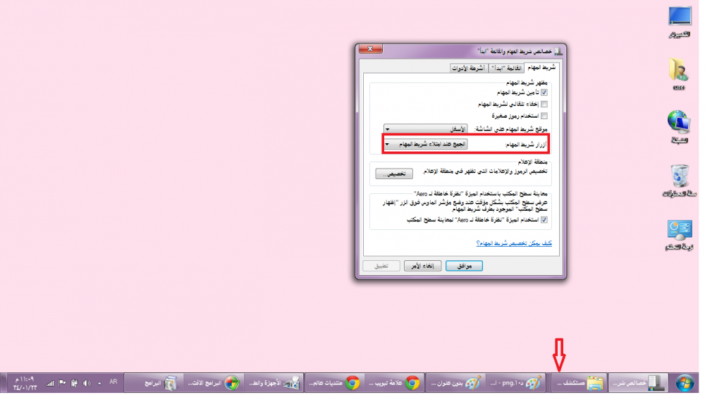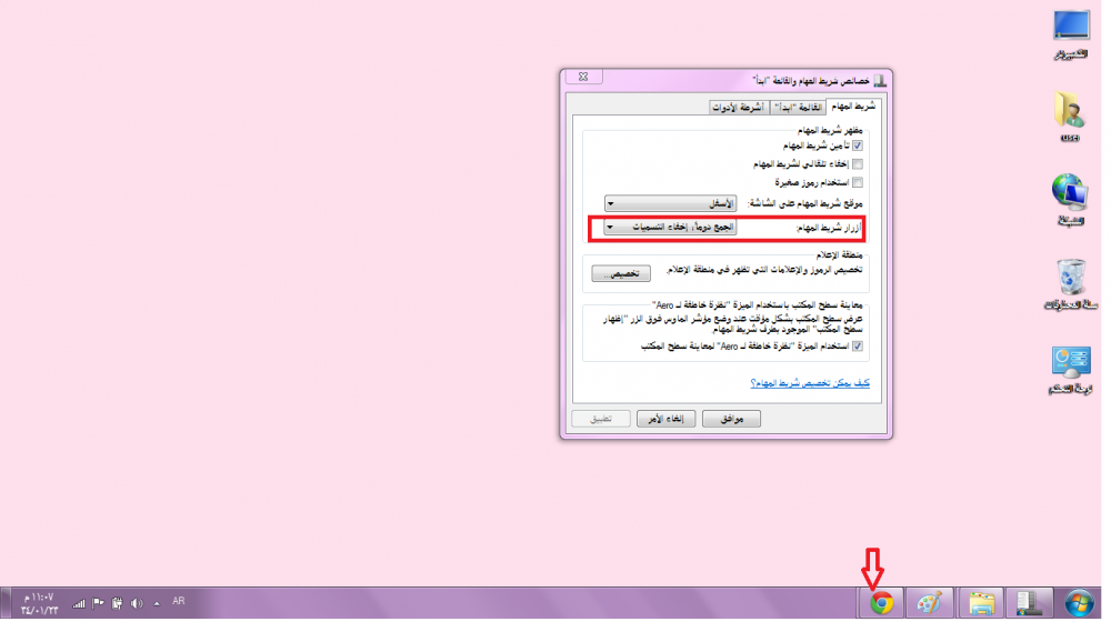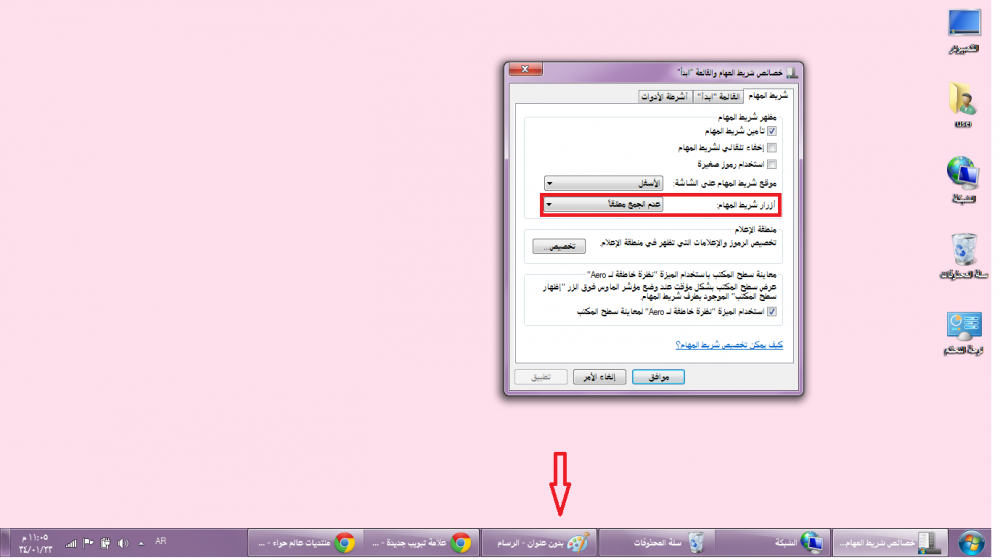 استخدام رموز صغيرة بحيث تظهر الرموز والايقونات على شريط المهام بشكل صغير