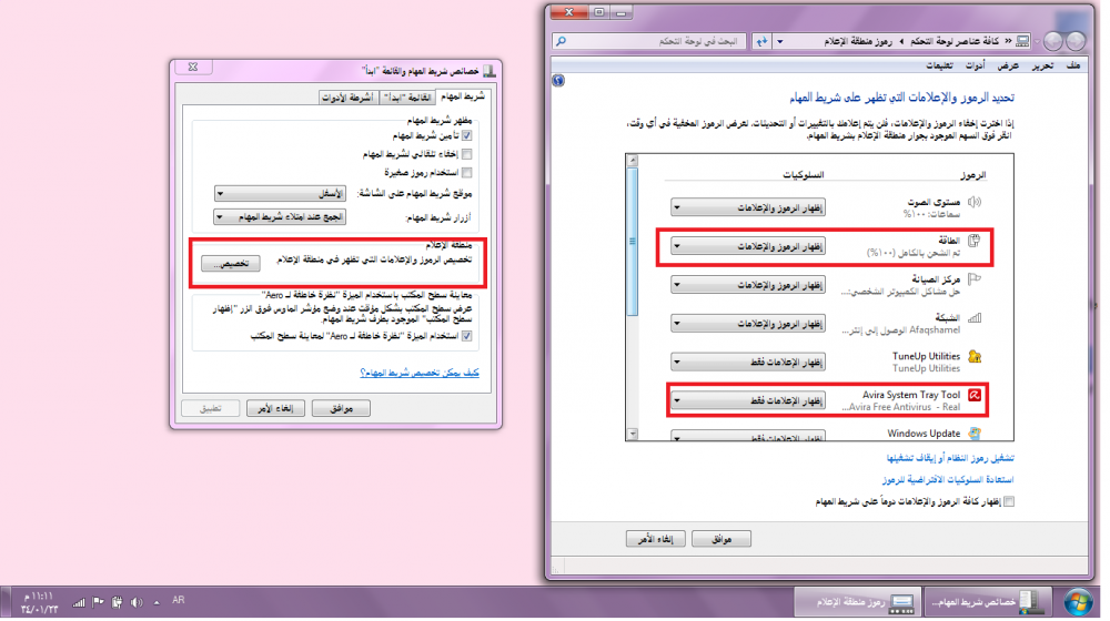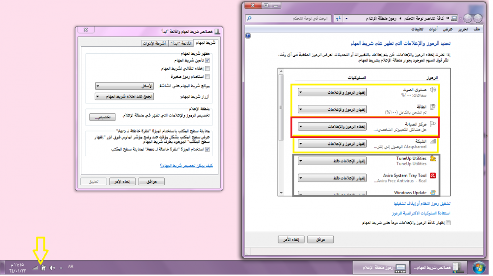 منطقة الاعلام اذا ضغطنا تخصيص تطلع هالنافذة كل رمز موجود عندة ثلاث خيارات