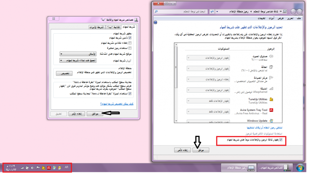 الحين نشوف طرق ترتيب الايقونات على شريط المهام :