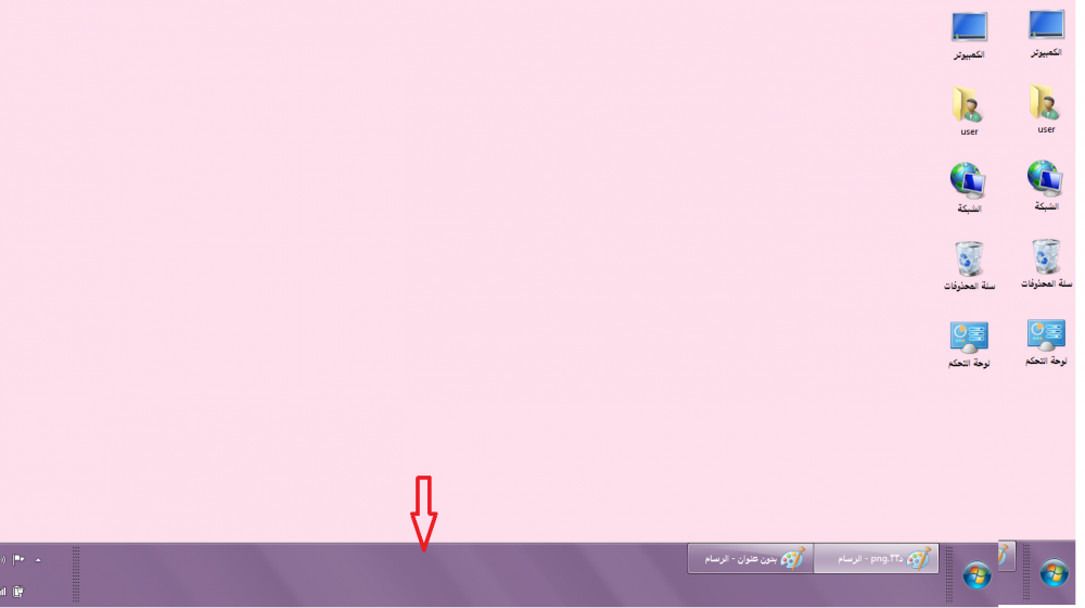 بعدين حطي الماوس على حافة الشريط يظهر لك سهم له راسين ابداي اسحبي شريط المهام للاسفل لتصغيرة او للاعلى لتكبيرة