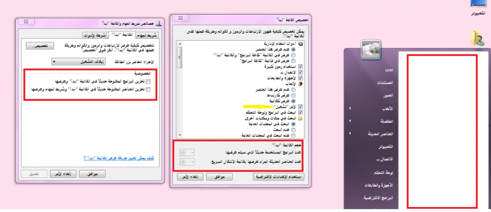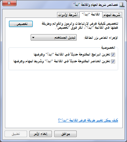 • التثبيت على شريط المهام والقائمة ابداء