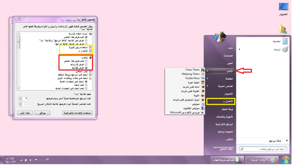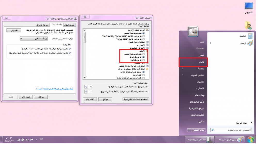 اضغطي على تخصيص تظهر لك هذة القائمة تحتوي أي شي نبغى نظهرة في الجهه اليسرى من قائمة ابداء مثلا اخترنا الالعاب عدم ظهور هذا العنصر شوفي الجهه اليسى اللي لونها موف غير موجودة الالعاب