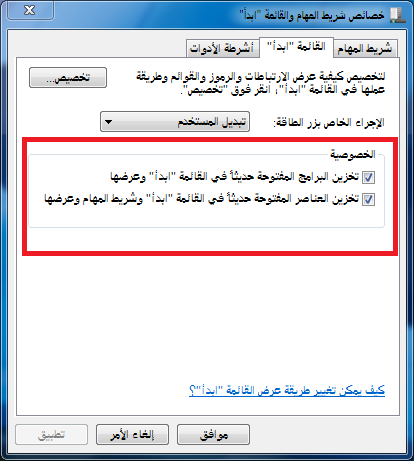 اما امر الخصوصية يعني كل برامج تفتحينة يظهر لك في القائمة ابدا والحين بنفهم كيف نختار الخيارين ثم نختار خيار تخصيص