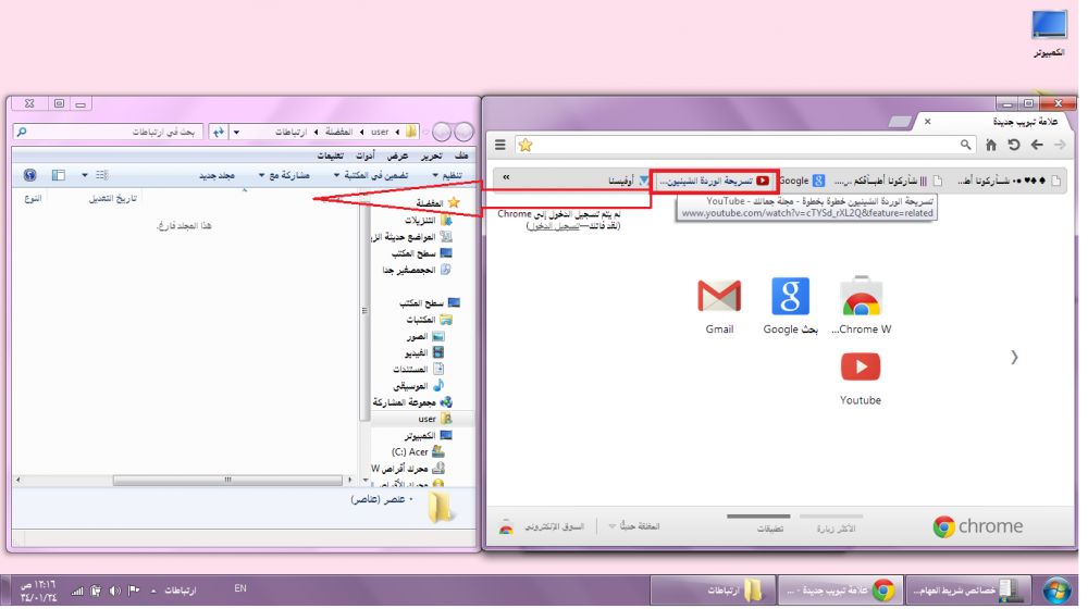 تظهر لنا الارتباطات على شريط المهام اضغطي عليها بزر الماوس الايمن تظهر لك قائمة اختاري فتح مجلد وافتحي صفحة الانترنت اللي حاطة فيها المفضلة والمواضيع المفضله اللي حفظتيها عندي محددة بالاحمر