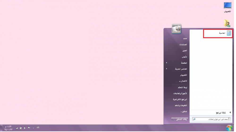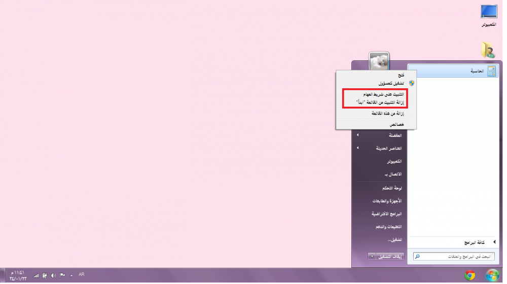 نختار مثلا برنامج الحاسبة نضغط علية بالزر الايمن تظهر قائمة اما يخيرك تثبتينة على قائمة ابداء او شريط المهام