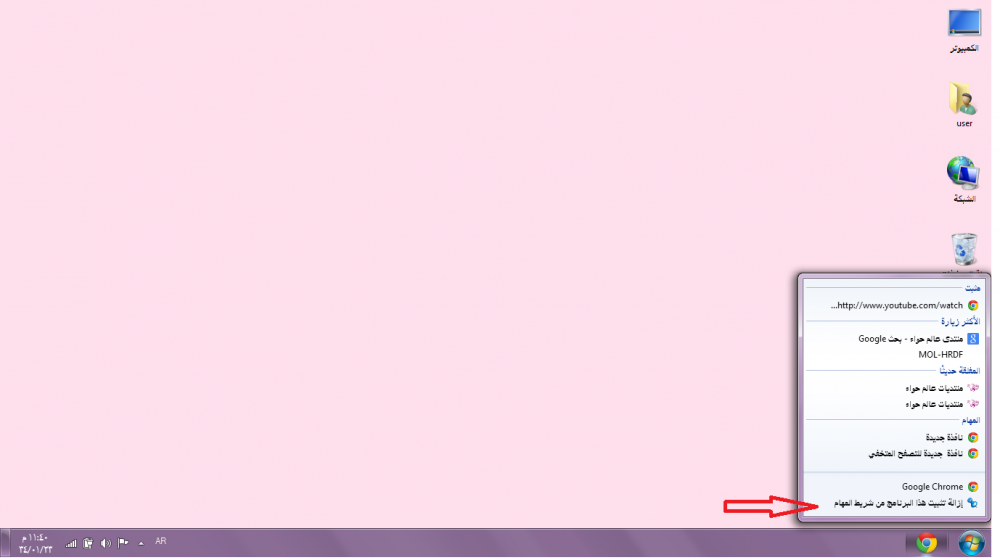 لو نبغى نزيلة من شريط المهام نضغط علية بزر الفارة اليمن ونختار ازالة من شريط المهام