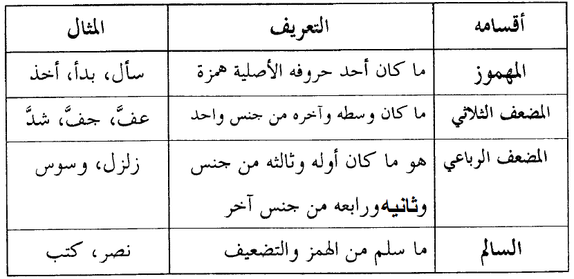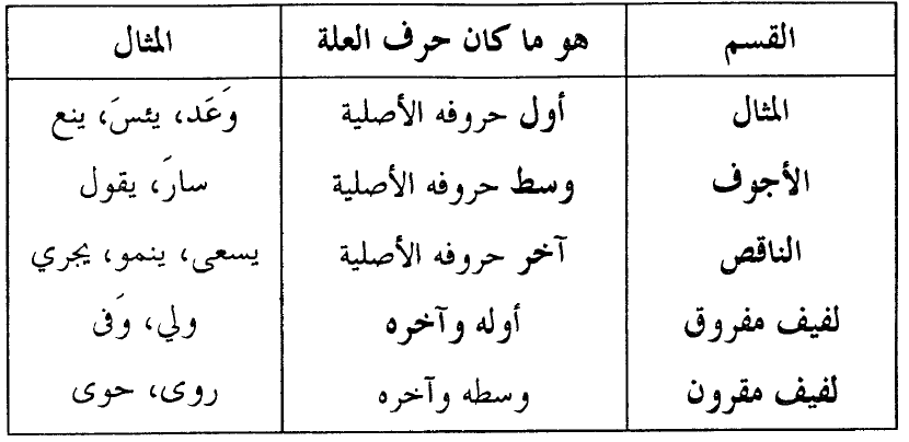 ينقسم المعتل إلى مثال، وأجوف، وناقص، ولفيف.