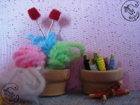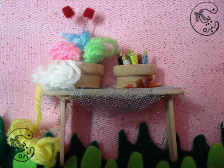 وجمبها طاولة فيها سبتين واحد فيه خيوط خياطة وطريقة عملها سهلة بأعواد الأسنان الخشبية قصيتها لأجزاء صغيرة جدا ولفيت عليها الخيوط وبس