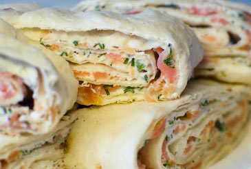 عيش التورتيلا مدهون بخليط جبن كريمي وبصل أخضر أو مخلل خيار مقطع صغير مع درسنج السلطه الجاهز ويرص عليه أوراق الخس وفوقها شرايح صدور الرومي أو الدجاج ثم يلف رول ويقطع
