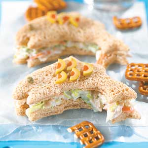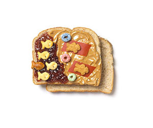 مدهون مربى وزبدة فول سوداني ومرصوص عليها حلويات بشكل أسماك