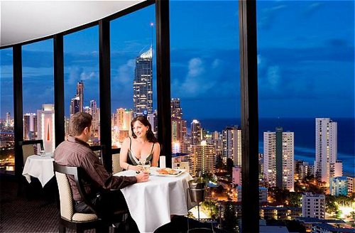 تناول وجبتك من بوفيه مفتوح وانت جالس في مطعم فندق كراون بلازا الدائري في الدور ال26 وانت تستمع بشاهدة الجولد كوست باكمله مع خلفيه موسيقيه رومانسيه هادئه