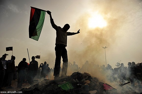 صورة ثائر ليبي يقف على كومة محروقة من كتاب الكفر والدجل (( الكتاب الاخضر )) الذي اردا القذافي ان يحل هذا الكتاب الاغبر محل كتاب الله في التشريع بل وحتى العبادات