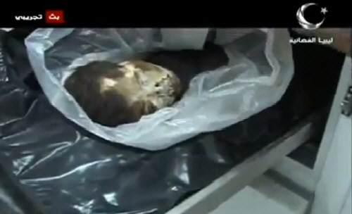 يد أحد ش?داء الزاوية العظام الذين نبشت قبور?م وأخرجت أجساد?م بعد دفن?ا في ميدان الش?داء وتم رمي?م في العراء دون دفن، الل?م تقبل الش?داء برحمتك وأسكن?م فسيح جناتك ... طفلة ليبية لا ذنب ل?ا بترت رجل?ا، من يأخذ حق?ا ويقتص