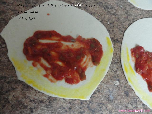 ثم ضعي صوص البيتزا ثم ضعي ما توفر لديك من اجبان
