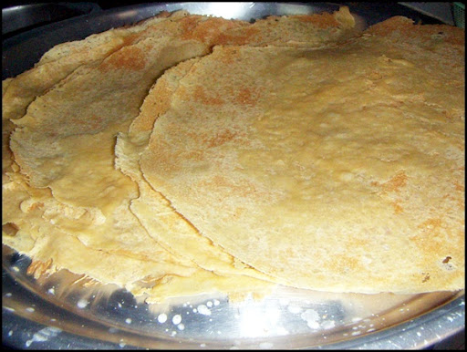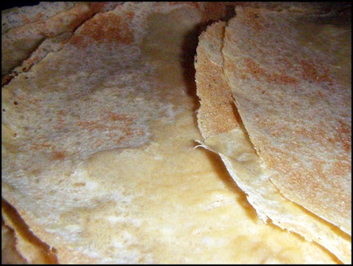 يضاف الدقيق الى وعاء العجن+ الماء + الملح ويعجن حتى يكون عجينه رخوه مطاطيه لفردها على المخبز