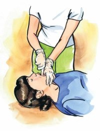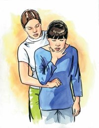 مع وضع قبضة يدك اليمنى على خصر المريض مكان الصره والاخرى فوقها وبدء بالضغط مع الرفع الى اعلى