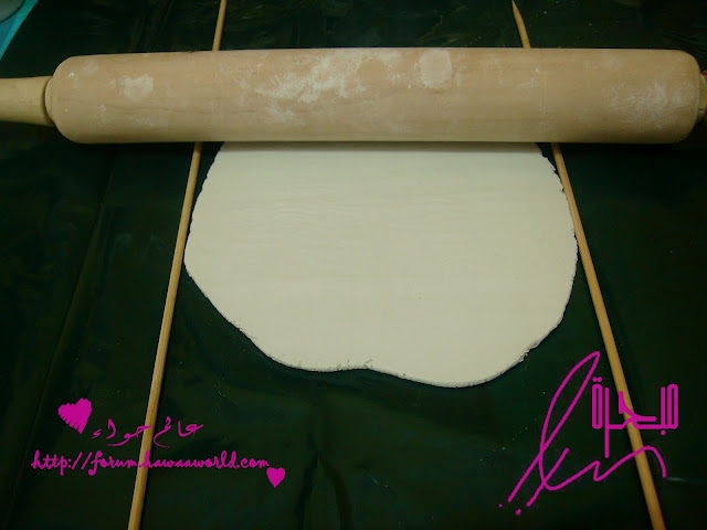 هينا مديت العجينة ووضعتها بين عودين شواء حتى تكون بنفس المستوى