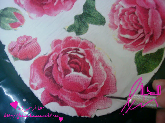 وبعد ما انتهيت من تركيب الورد في مكانه بدأت اضغط عليه الى الداخل شيء بسيط حتى يطلع بروز في الورده