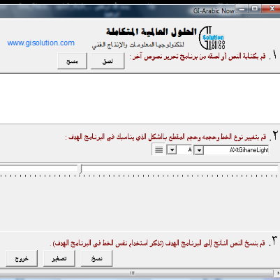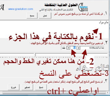 عند فتح البرنامج يكون بهذا الشكل الكلام واضح بالعربي على واجهة البرنامج اذا ظهرت الحروف العربيه علامات استفهام او غيره فان المشكلة في الويندوز يجب ان يعرب تذهبي الى لوحة التحكم control paelوتختاري اللغة والمنطقةlanguage and regional وبتطلع نافذة مقسمه الى اربع اقسام اول قسم بتختاري العربيه مع المنطقة ثاني صفحة location اي المنطقة يتختاري المنطقة ثالث صفحة keyboard بتختاريchange language اول جزء في الصفحة ثم بتختاري العربيه keyboard هنا ليس من الضروري تغير الخط وحجمه هنا بعرفك على البرنامج فقط هنا بتعملي لصق او ctrl +v يظهر الكلام غير واضح بتحددي الكلام عند تغير الخط بتبحثي عن الخطوط يكون بدايتها AX يوضح الكلام الان يتبععند فتح البرنامج يكون بهذا الشكل الكلام واضح بالعربي على واجهة البرنامج اذا ظهرت الحروف...