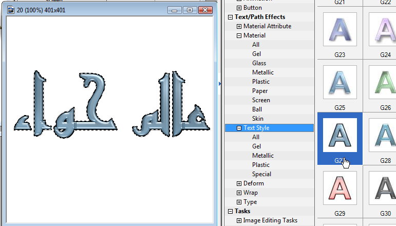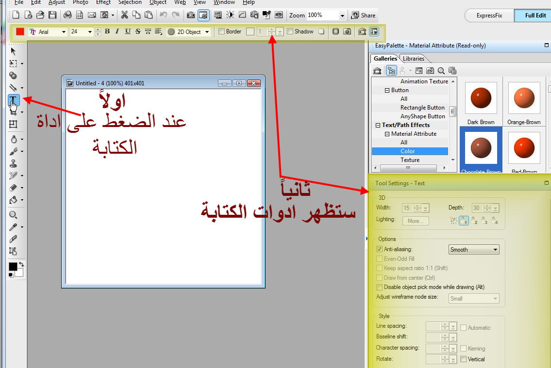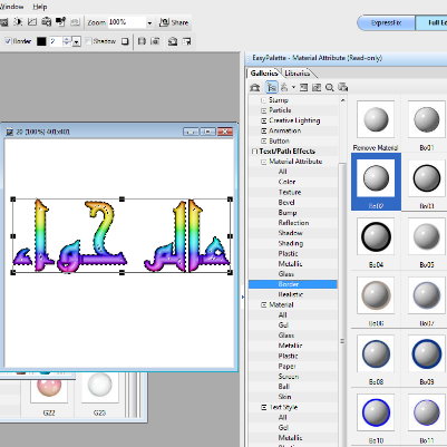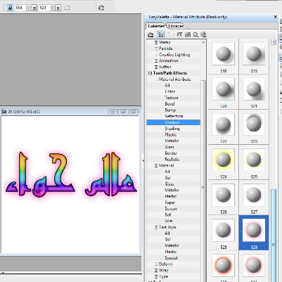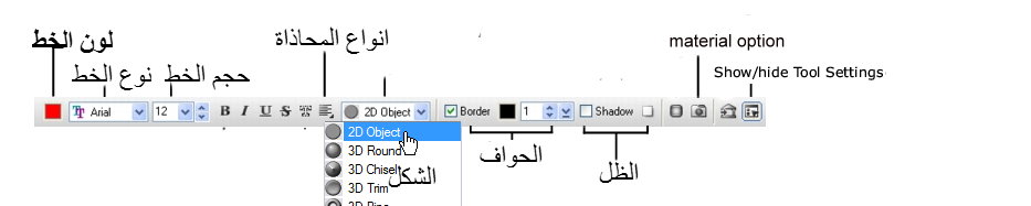 اداة الكتابة عند الضغط على Pick tool المؤشر على اداة الكتابة ستظهر لنا توابع اداة الكتابة وبعد ما فتحنا صفحة جديدة وكتبنا بالعربي وحددنا الخط وحجم الخط بيظهر علامات مربه صغيرة حول الكلام من هذه المربعات ممكن تكبري الخط وتصغريه لتحويل الكتابه الى ثلاثي الابعاد وايضا أشكال رائعة وبمساعدة الeast palett الادوات path/ path effect بيفتح معاك material و material attribute وغيرة هنا تجدي جمال الالوان والمواد ( زجاج - بلاستيك .....الخ ) والظلال والتحديد وما عليكي الا ان تجربي الاشكال كما تحبين ولكن بعضها يجب عليك ان تفعلي 3d عملت هنا بعض العينات يتبعاداة الكتابة عند الضغط على Pick tool المؤشر على اداة الكتابة ستظهر لنا توابع اداة الكتابة ...
