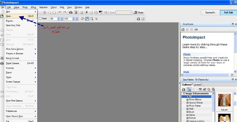 اذهبي الى جهاز الكمبيوتر وافتحي الجزء c -- افتحي ملف program file --في اخر القائمه تقريبا ستجدي ملف ulead systems وبعدين بتلاقي ملف ulead photoimpact 12 --افتحي هذا الملف بتجدي 3 ايقونات كاميرا اللي هي ايقونة البرنامج اتركي الايقونه مكتوب IE اما الثانيه مكتوب بجانب الكاميرا Idite اضغطي عليه مرتين بيفتح معاكي البرنامج اذا لم يفتح يبقى المشكلة في الويندوز وطمنيني على النتيجه