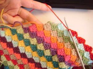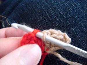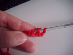 عند الغرزة المشار لها بسهم في الصورة الأول ندخل الأبرة ...سيكون عندنا على الأبرة غرزتين كما في الصورة ..