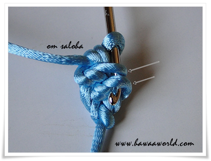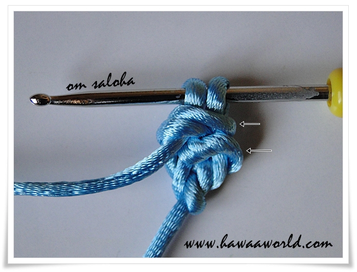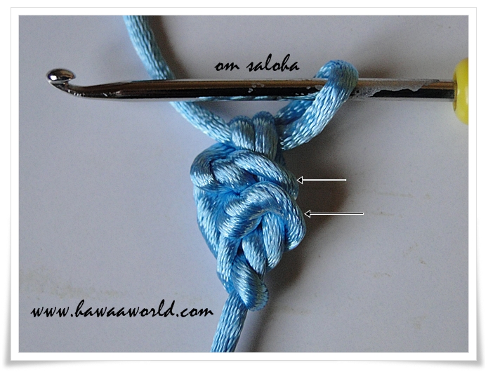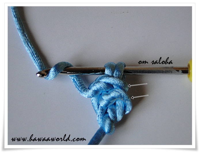 ونخرج الأبرة من العروتين ليبقى عندنا أيضا عروتين على الأبرة ...لاحظي السهمين على الصورة ... نعمل لفة على الأبرة ونسحب العروتين سحبة واحدة ...لاحظي السهمين الجدد .. سنعيد الكرة من جديد مكان السهمين سندخل الأبرة .. تابعي الصور ..والأسهم ...ونخرج الأبرة من العروتين ليبقى عندنا أيضا عروتين على الأبرة ...لاحظي السهمين على الصورة...