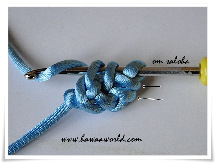 نعمل لفة على الأبرة ونسحب العروتين سحبة واحدة ...لاحظي السهمين الجدد ..