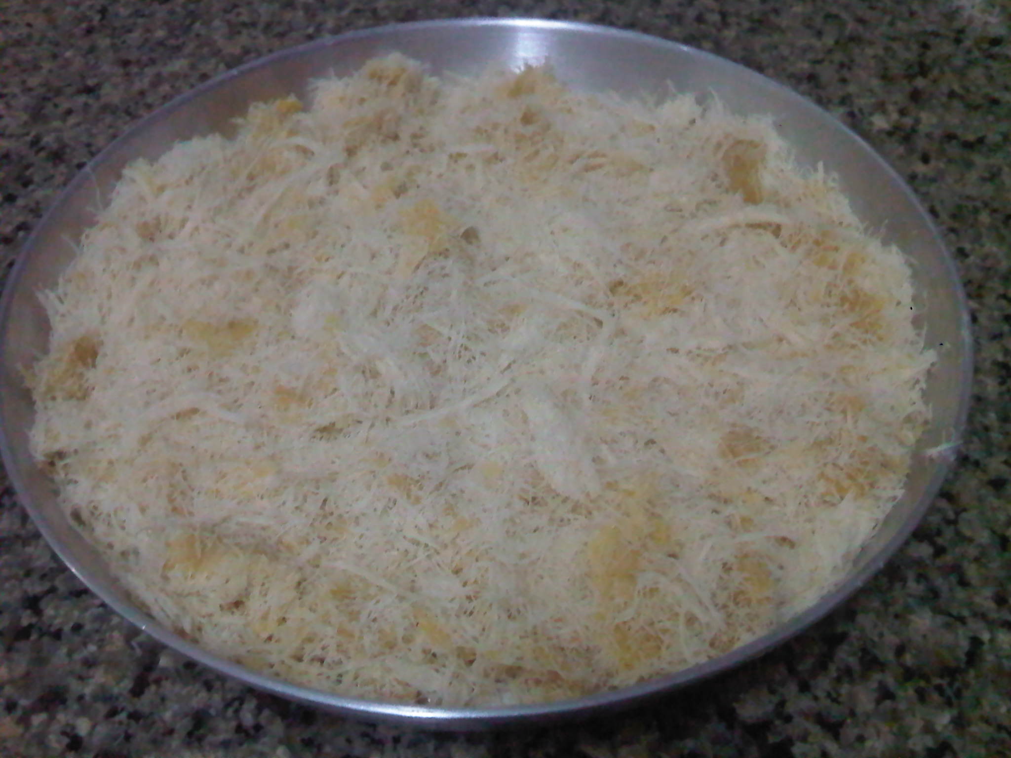 نجيب سلطانية ونقطع الكنافة قطع صغيرة ونفركها نفتحها من بعضها ونفركها بعد كدة بالسمن
