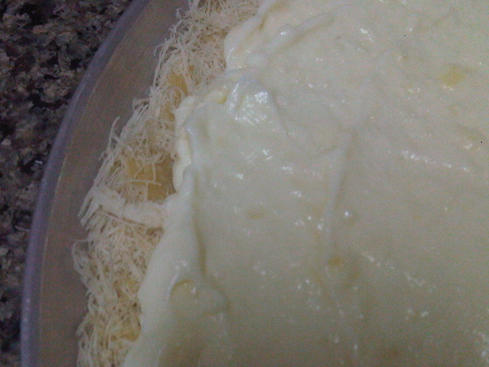 ناخد نص مقدار الكنافة ونفرشهافي صينية مدهونةسمن ونوزعها بالتساوي ونحط صينية فاضية اصغر منها بداخلها ونضغط ونشيلها حنلاقيها اصبحت مستوية