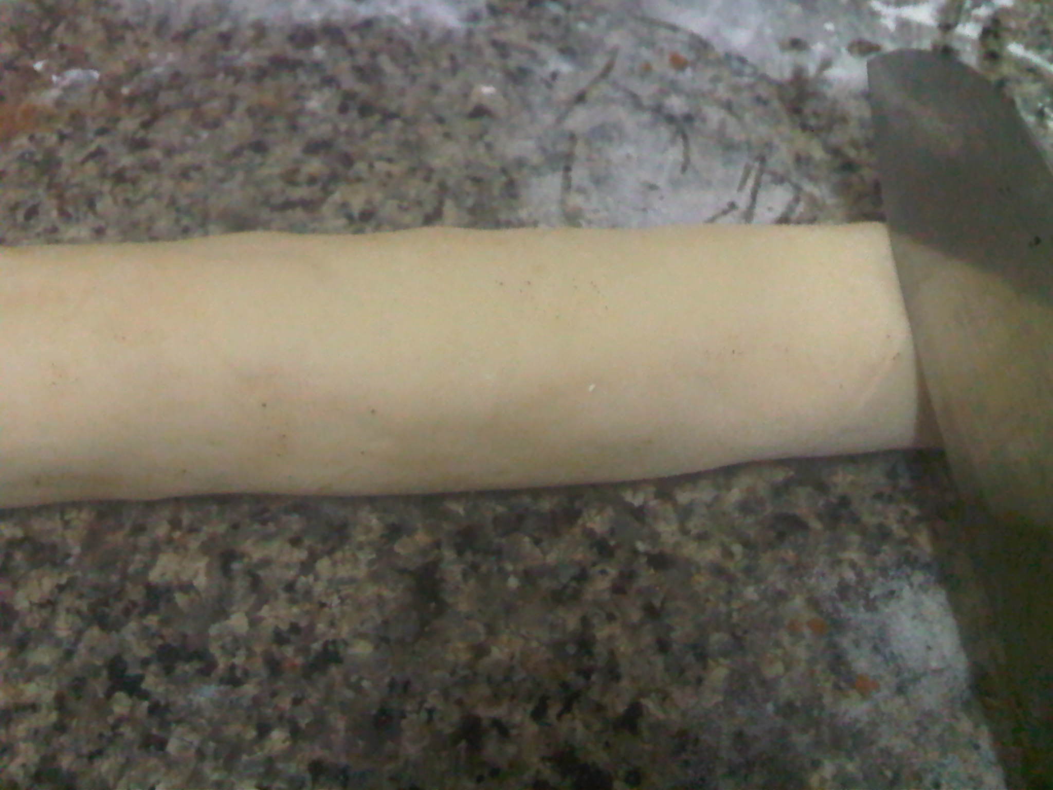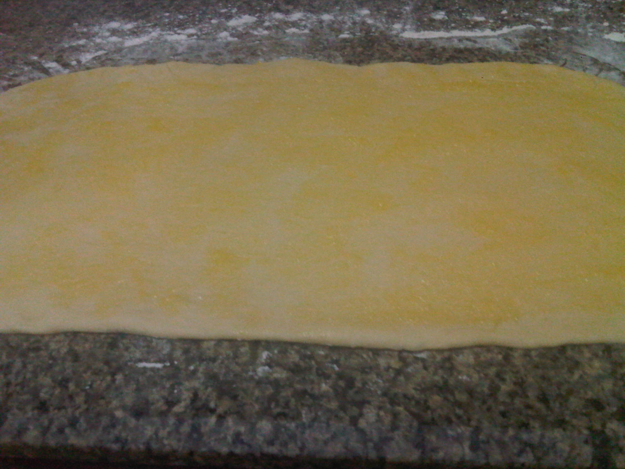 افردها علي سطح مرشوش علي شكل مستطيل قدر الامكان وبتخانة حوالي نص سم وادهنها بالفرشه سمن