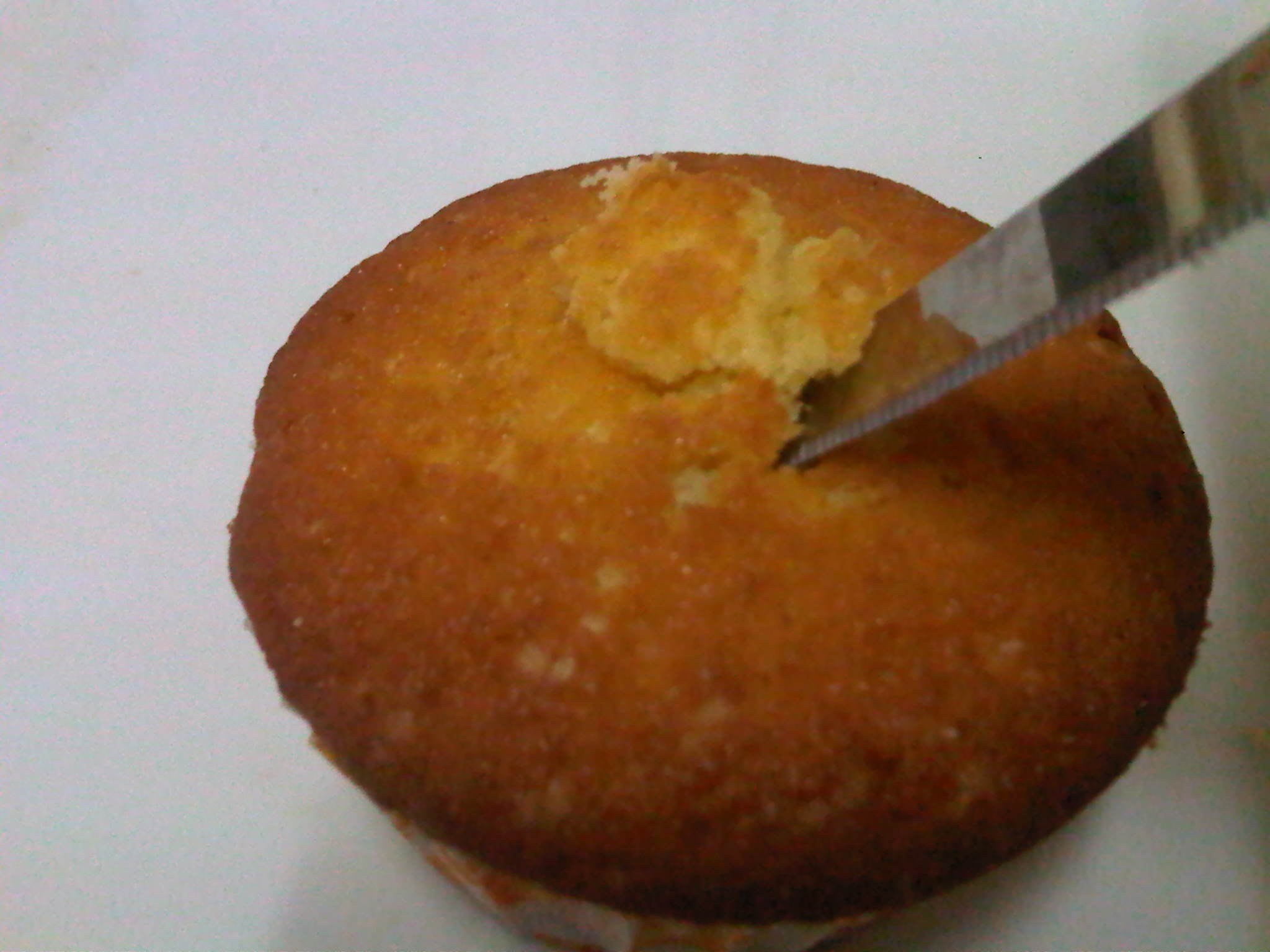 نجيب حبة الكيك ونقور جزء صغير بالسكينة وندخل القمع ونملا ونرفع ايدينا تدريجي علشان نخرج بالكريمة لبرة علي وش الكيك