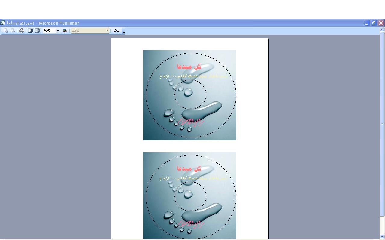 السلام عليكم التطبيق الثاني : ملصق الـــــــ (سي دي ) وهنا معاينة الطباعة لنسخة واحدة في الصفحة بعد التأكد من التصميم(دون حدود )السلام عليكم التطبيق الثاني : ملصق الـــــــ (سي دي ) وهنا معاينة الطباعة لنسخة واحدة في...