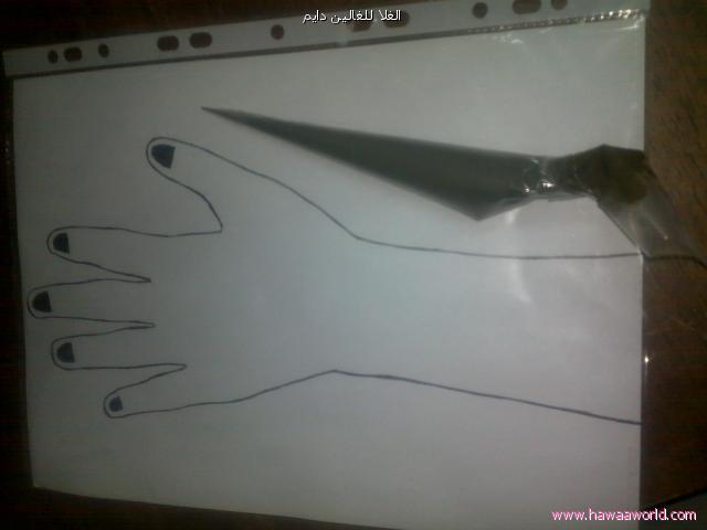 عاد جاء دور اليد الي ابغى احنيها جلست على طاولت المطبخ منسجمة في الرسم والبيت كله هادي ونايم ومدريت الا ضحكت ابو الشباب :arb:على ويقول شكل قلت النوم اثرت في عقلك وخلتك ترسمين يدك ليه خايفة عليها تضيع عاد انا انقهرت :mad:من كلامه وقلتله لاابغى اعطيكيها ذكرى وراح وهو يضحك فقررت اني مستحيل عاد ارسم يد مره ثانية لكن انا ابغى اشارك في الدورة:44: قمت عملت تغليف حراري للورقة عشان يسهل الرسم والمسح عليها وماعاد ارسم ايدي مره ثانية واضحك الحبايب عليا وكمان صورتها للذكرى
