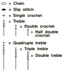 واليكي هنا هذه الصورة لتشاهدي اطوال غرز الكروشيه اي العمواميد ورموزها لكي تعرفيها على الباترون المرسوم ولاحظي ان الغرزه النصف ثلاثيه تكون عمود بدون شرطه اما الثلاثيه فهي عمود بشرطه ثم الثلاثيه المضاعفه فهي عمود بشرطتين في منتصفه وعدد الشرطات في منتصف العمود تدل على عدد لفات الخيط حول الابره