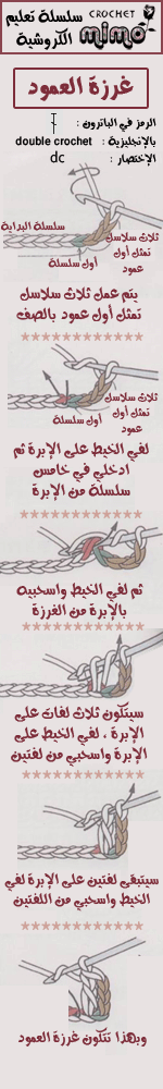 * غرزة العمود طولها = 3 سلسلة ، ومعنى هذا أنّنا إذا أردنا البدء في صف ما بغرزة العمود يتم أوّلا عمل 3 غرز سلسلة (تمثل ارتفاع غرزة العمود ) ثم نستكمل الصّف حسب الباترون.