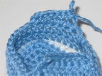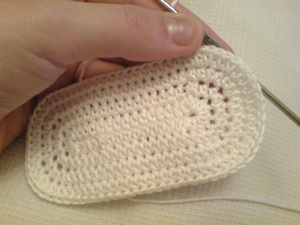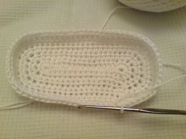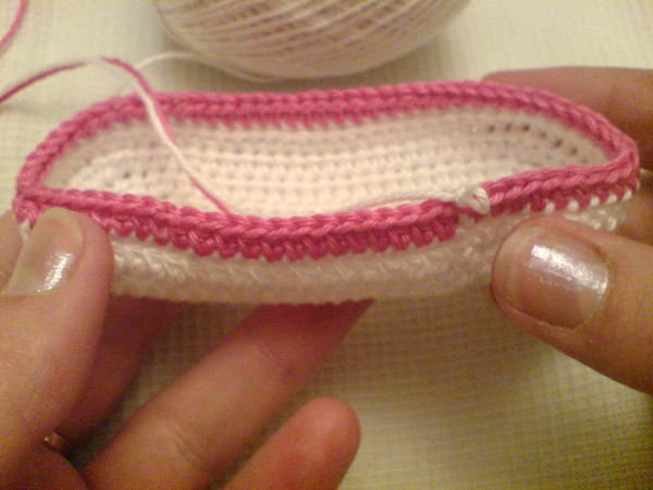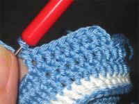 السطر الخامس : نرتفع 3 س بداية اول عامود .. ثم 1 سلسله .. ثم نترك غرزه على السطر .. ثم 1 عامود بالغرزه التاليه ... ونكرر الى ان نصل لوجة الحذاء من الامام لننتقل للجهه الاخرى بغرزة عامود ثم 1 س ثم نترك غرزه عالسطر ثم عامود بالغرزه التاليه ونكرر الى النهايه