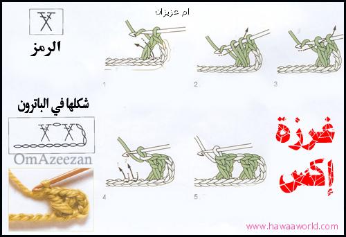 بعد مانسوي اول عامود راح نترك الغرزه التاليه بدون شغل .... ثم ندخل الابره على الغرزه اللي بعدها ونعمل عامود .... ثم نرجع على الغرزه اللي تركناها بالاول ونشتغل فيها العامود وبهذا راح يكون عندنا شكل الاكس