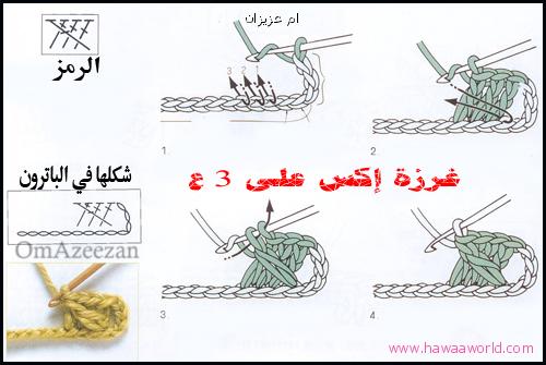 اما هنا نترك اول غرزه ثم نعمل 3 عامود ثم نرجع على الغرزه الاولى اللي تركناها