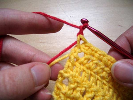 بعدعمل عدد من السلسلة تاخدي الأبرة وتدخلي السنارة بالسلسله اللي قبل اللي انتي وصلتيلها عرفتي كيف شوفي الصورة وتسحبي الخيط منها عشان تتحصلي علي 2 عروات علي الأبرة شوفي النتيجه