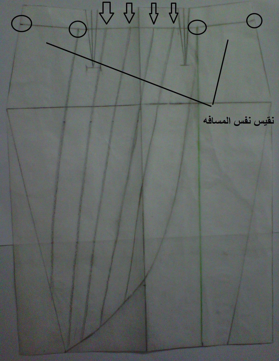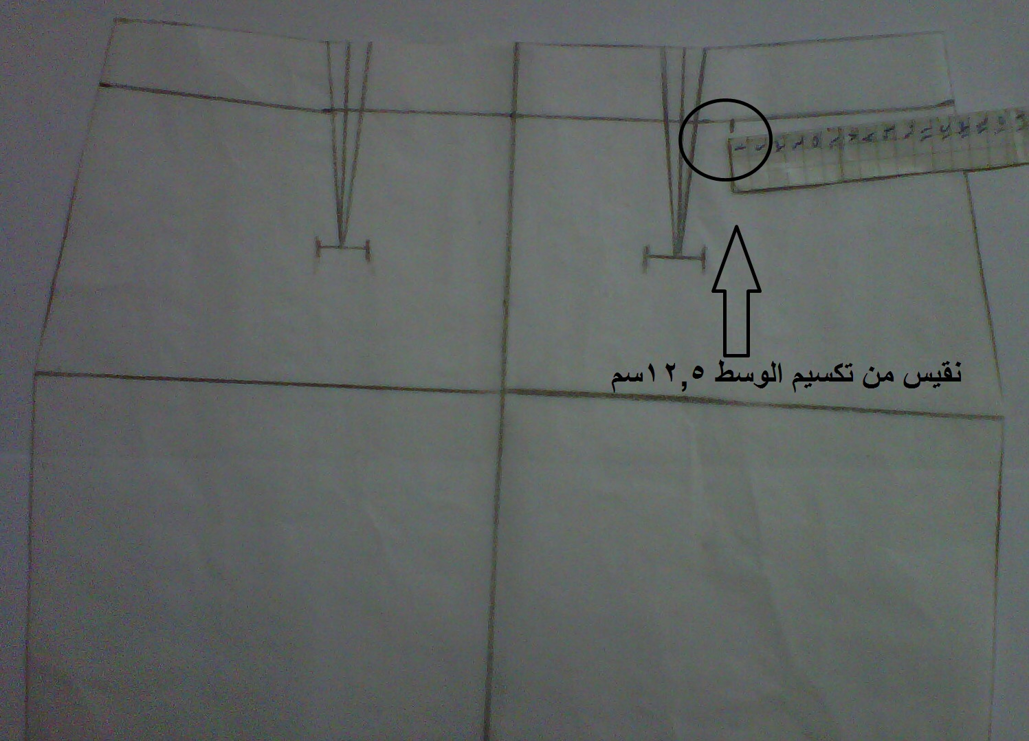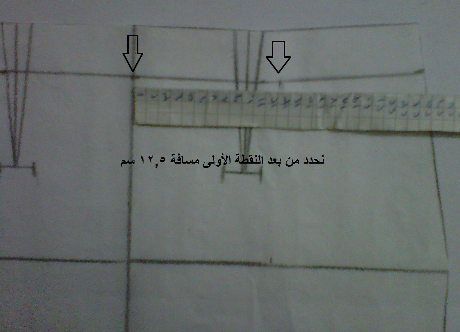 ننزل من خط الوسط 4سم ومن اول عامود للبنسة 4سم ومن خط نصف الخلف 4سم ونرسم القصة