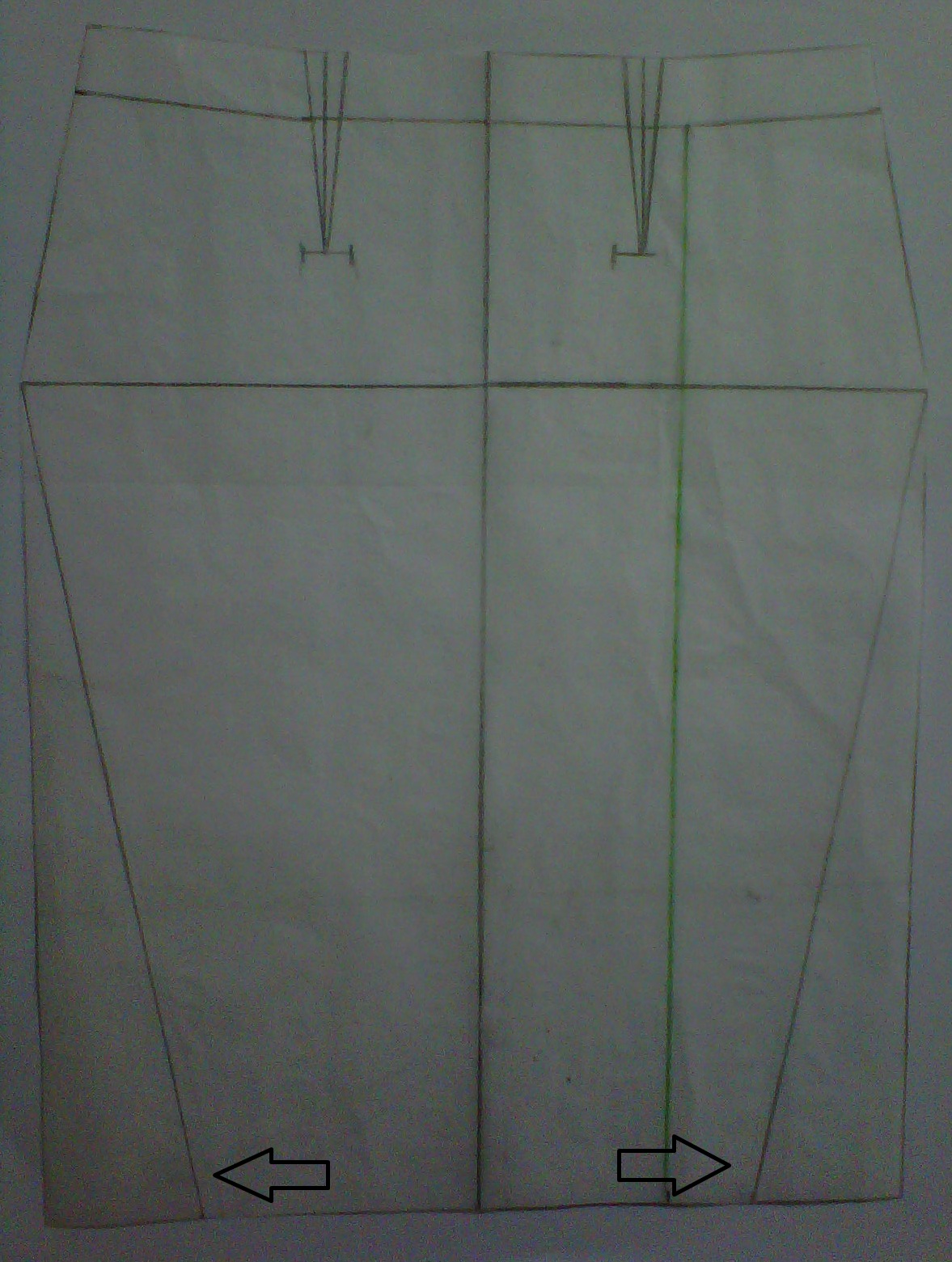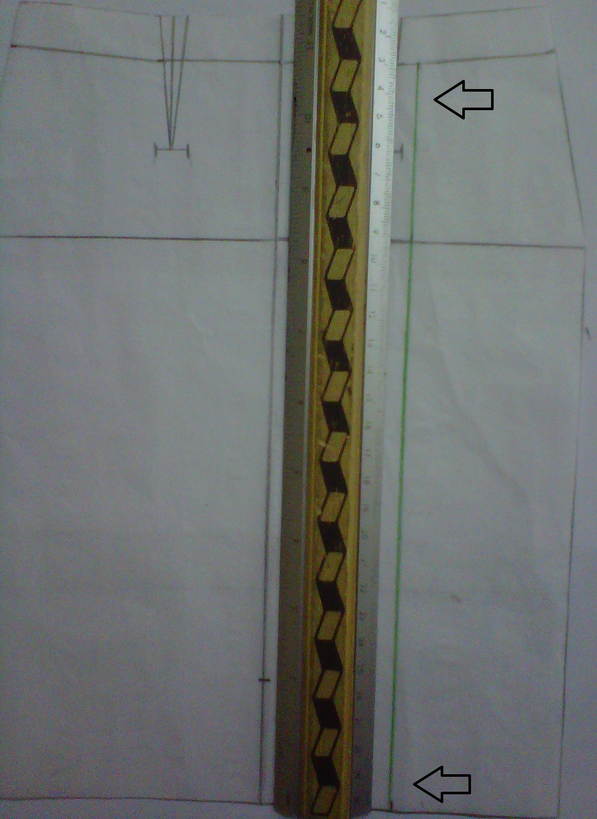 الآن نرسم خط تحديد النسيج لاننا يعد قص الباترون وعمل التوسيع يصعب علينا وزن الباترون عالقماش خاصة أذا كان القماش مشجر او بكاروهات او له خطوط معينه