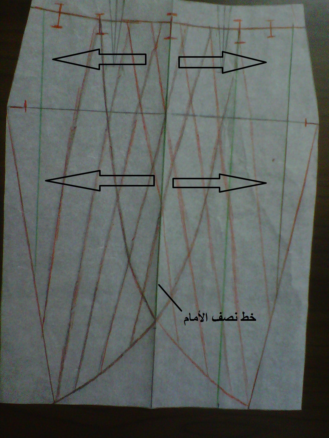 لحساب عرض القماش الكافي ( عرض الباترون من اعلى + مسافه التوسيع كامل + علامة الخياطة 3سم + 2سم أحيتاط = لناتج يؤخذ على القماش وهو مثني )