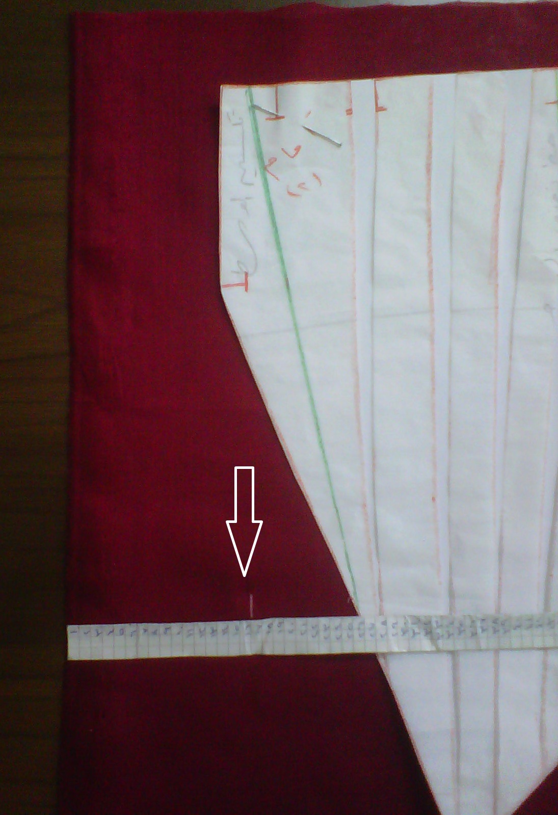 نقيس من خط النسيج الى خط البرسل ( طرف القماش ) ونراعي مسافة لعلامة القص