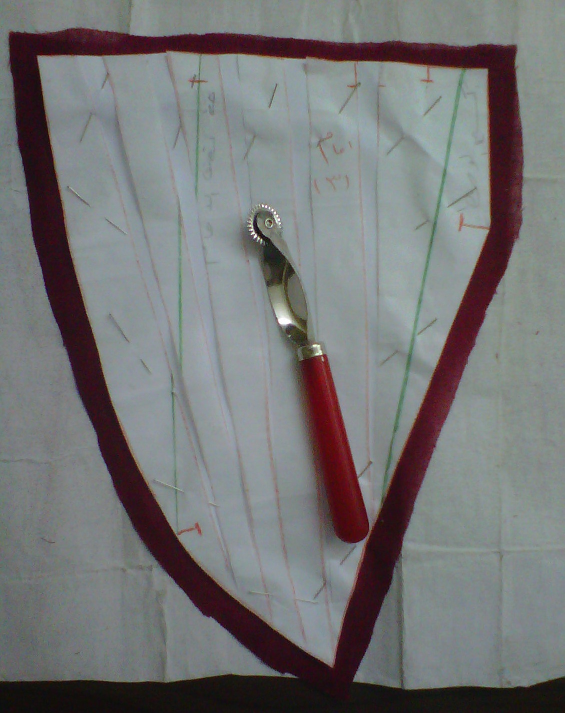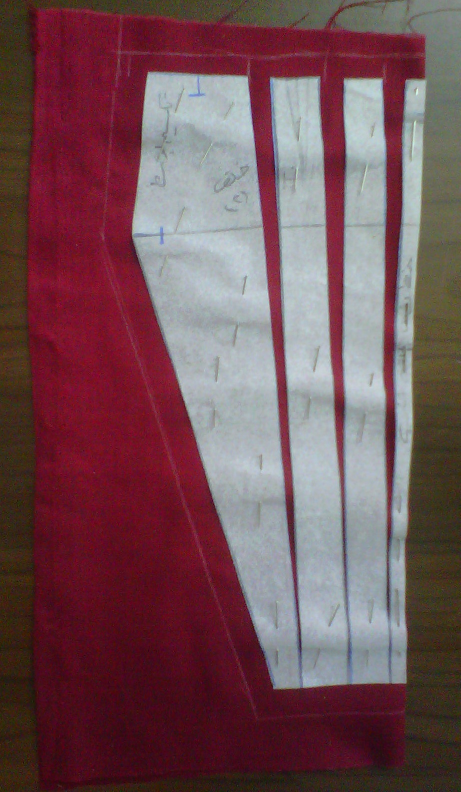 نضع اول عامود على قماش مثني ونثبت بالدبابيس ثم نقيس 2سم ونثب بالدبابيس العامود الثاني