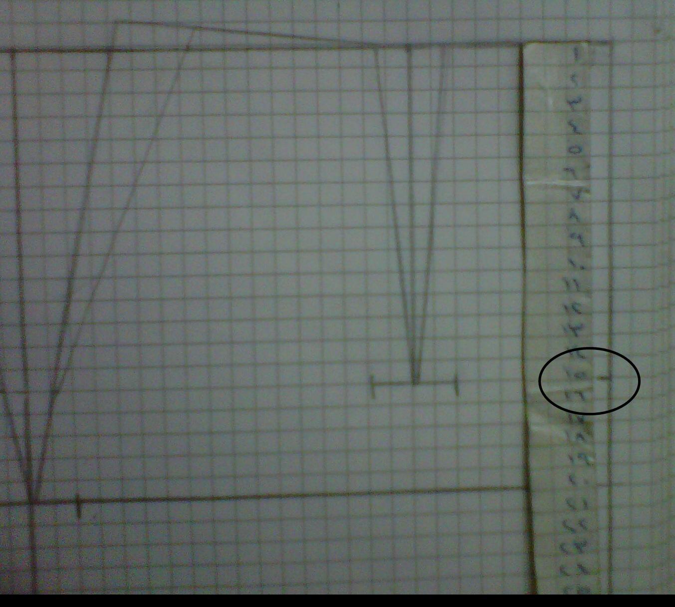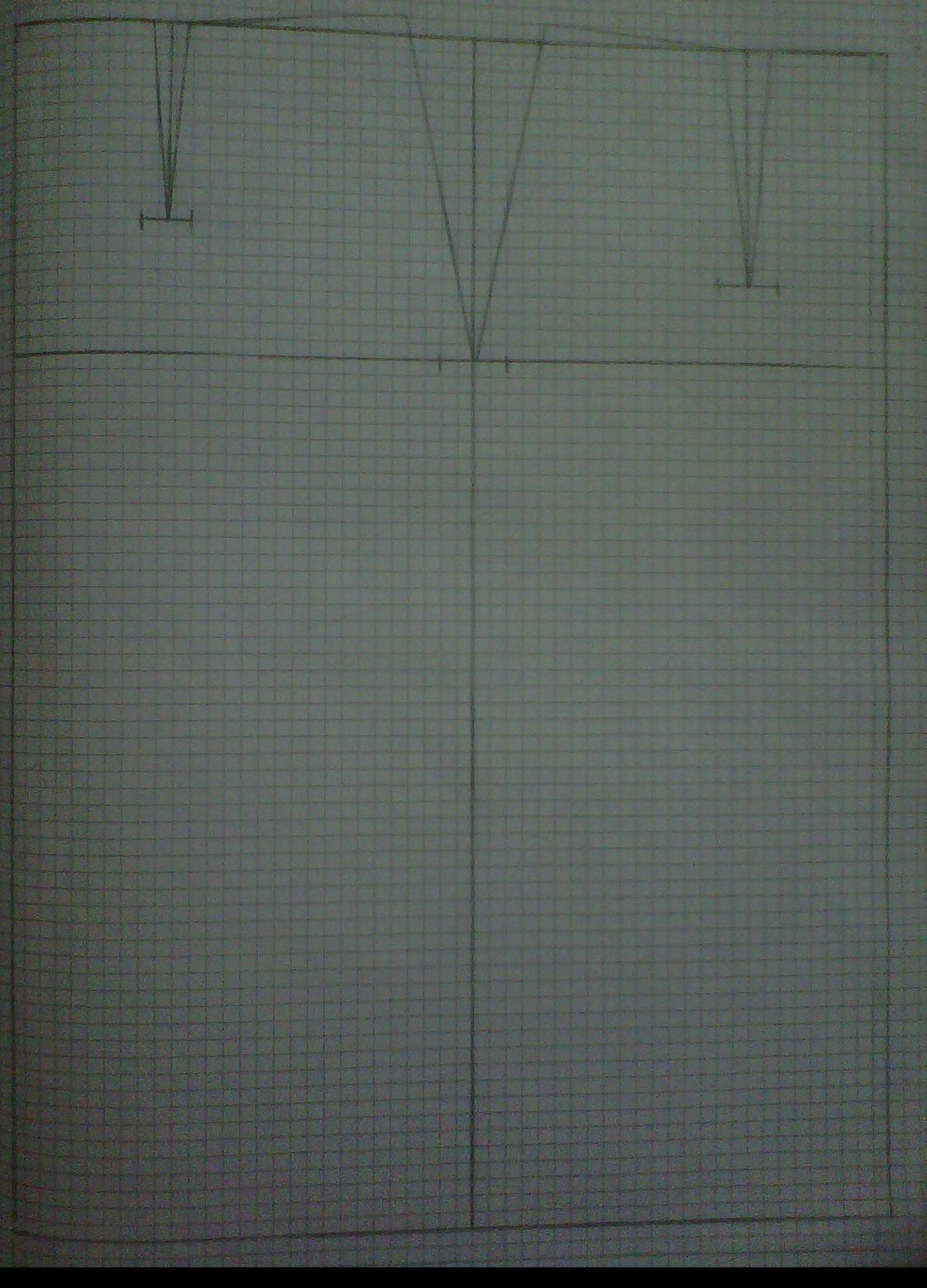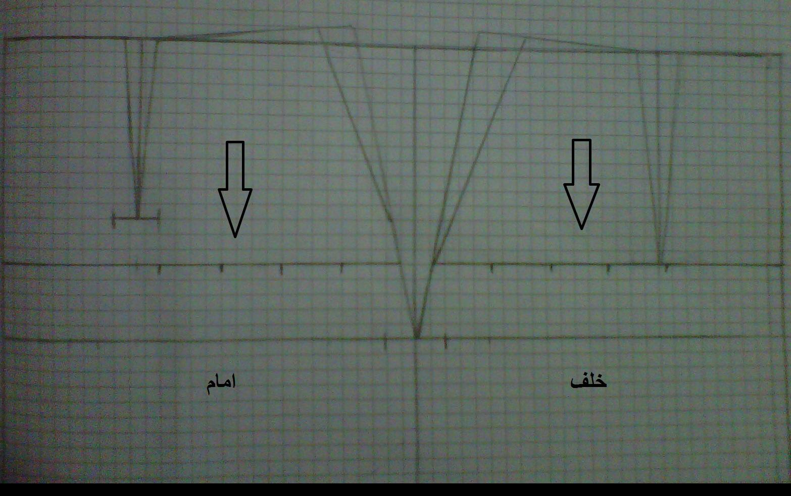 هنا انتهينا من انزال الموديل عالباترون .. نبدا نحدد العلامات بين القصات( لسهووله تركيبها مع بعض عند الخياطة ) وكذالك نكتب أجزاء الباترون