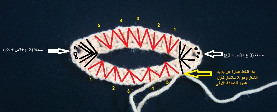 بعد ما تعملي السلاسل وتشبكيهم بمنزلقة ارتفعي 3 سلاسل كأول عامود بعهدها في نفس المكان اعملي عمودين وثلاث سلاسل وبعدها 3 اعمدة مثل ما تشوفونهم في الشكل