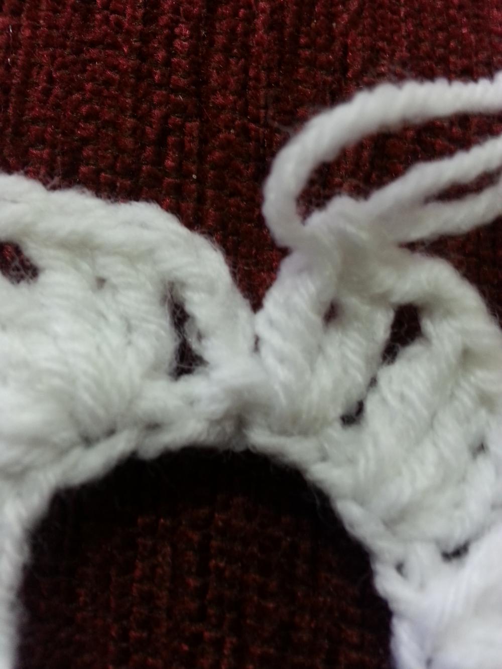 بعد ما تعملي غرزة الصدفة واللي هي عبارة عن (3غرز عمود ثم 3 غرز سلسلة ثم 3 غرز عمود ) كلهم الي داخل القوس بنعملهم داخل غرزة سلسلة وحدة و وهاي بنسميها غرزة الصدفة